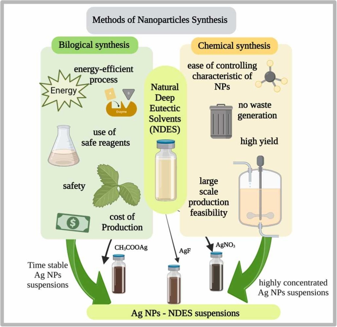 A key challenge in nanotechnology remains the development of methods to produce nanoparticles in high concentrations that are stable over time, without relying on toxic or costly reagents. The aim of the study was to analyse the effect of the composition of natural deep eutectic solvents on the stability, concentration and size of formed silver nanoparticles (AgNPs).